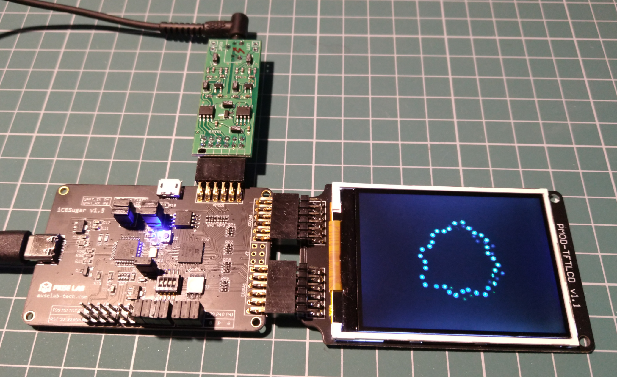 Light-organ based on iCESugar 1.5 board (Lattice iCE40UP5k), nameless SPI TFT LCD display from AliExpress, and sound capture board Dual MCP3102.